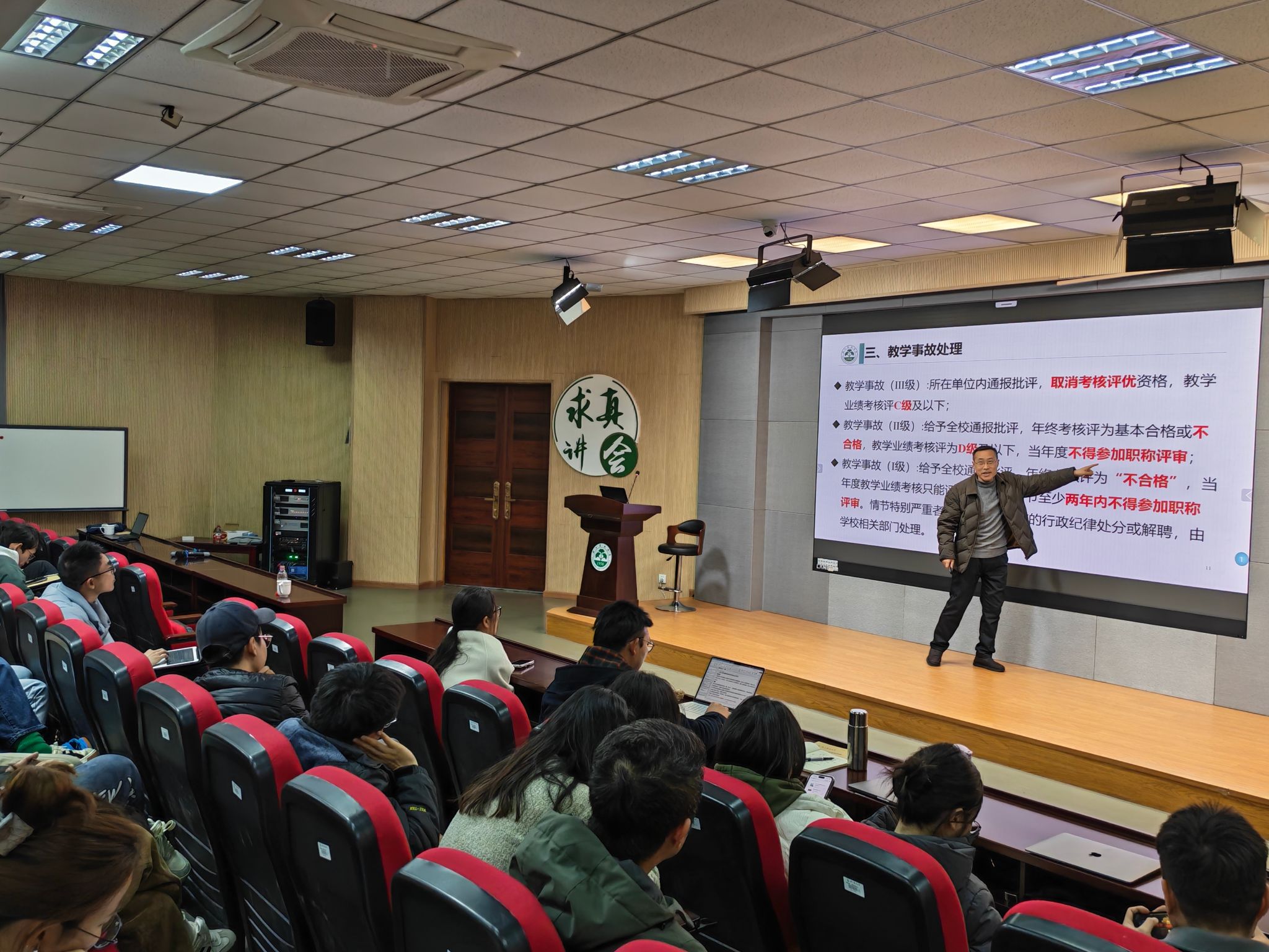 尹国俊则围绕教学事故的防范展开专题讲解,从教学事故的涵义、认定、处理及防范举措四个方面,为青年教师梳理了教学工作中的风险点。他强调,教学事故直接扰乱正常教学秩序,影响学生教学效果与教师职业发展,提醒青年教师严守教学纪律、强化责任意识、筑牢安全防线。